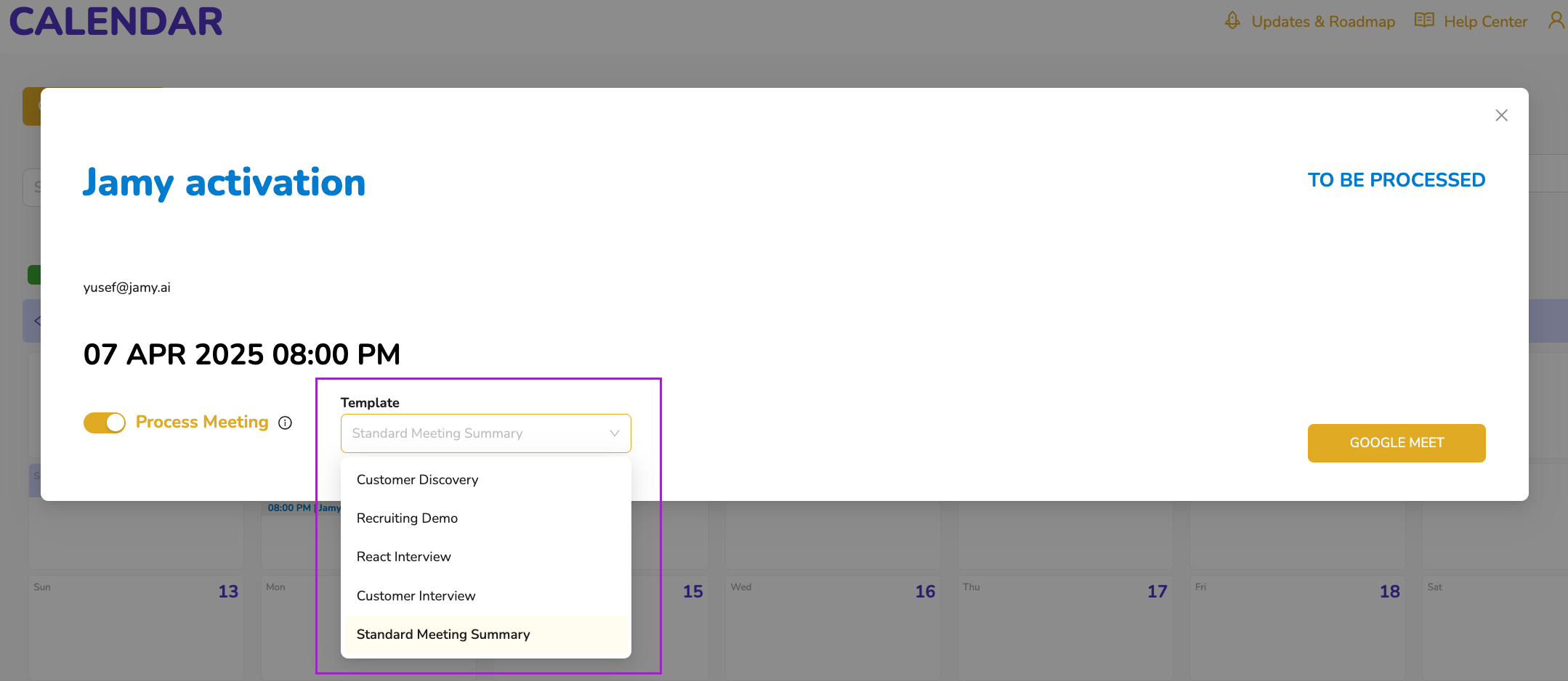 You can go to the Calendar view, either monthly or daily, and choose a specific Template for a meeting with status to_be_processed . Jamy will process that meeting and generate a Report using the Template you chose.
