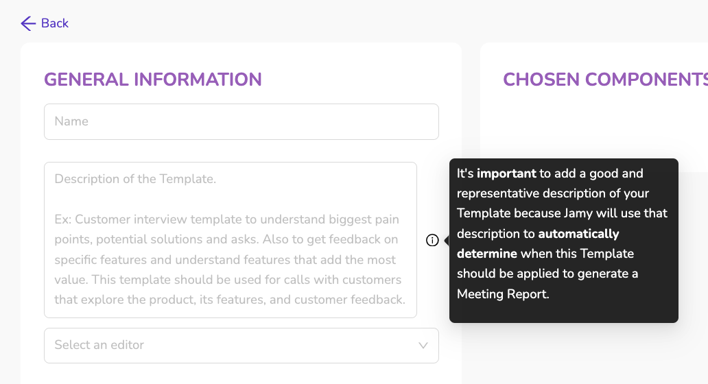 Part of the fields you need to fill out when creating a Template is the Template's description. In the Description you basically write what that Template is going to be used for. The more details the better. You are basically telling Jamy when it should use that Template to generate a Meeting Report.