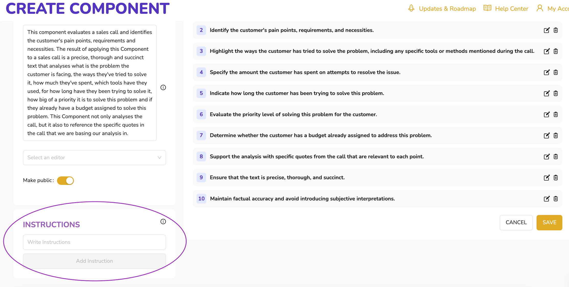 Remember, we want a Component that evaluates a sales call and identifies the customers pain points, requirements and necessities. The result of applying this Component to a sales call should be a precise analysis of what is the problem the customer is facing, the ways they've tried to solve it, how much they've spent, which tools have they used, for how long have they been trying to solve it, how big of a priority it is to solve this problem and if they already have a budget assigned to solve this problem. We want not only the analysis, but also to reference the specific quotes in the call that we are basing our analysis in.