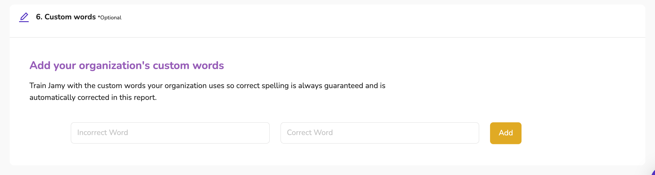 You can add your organizations Custom Words so Jamy always spells them right. Here's how: